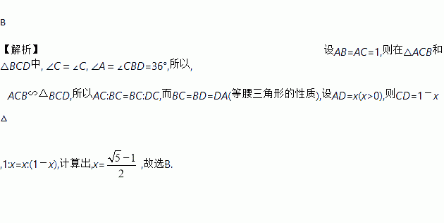 如图,已知在等腰△ABC中,顶角∠A=36°,BD是∠ABC的平分线,则的值为( )