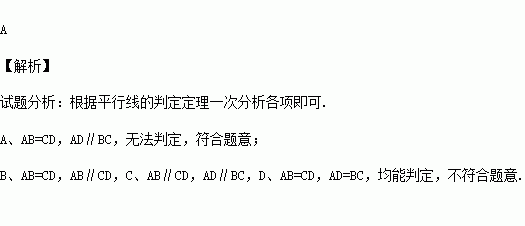 A、AB=CD,AD∥BC B、AB=CD,AB∥CD