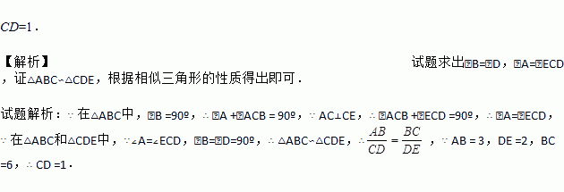 如图,在△ABC和△CDE中,∠B=∠D=90°,C为线段BD上一点,且AC⊥CE.AB=3,DE=2,BC=6.求CD的长.