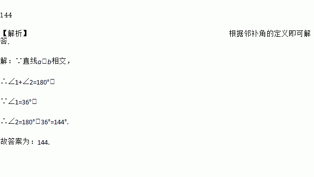 如图,直线a、b相交,∠1=36度,则∠2=________度.