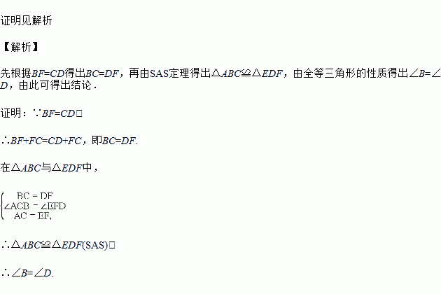 已知:如图,B,F,C,D在同一条直线上,∠ACB=∠EFD,BF=CD,AC=EF.