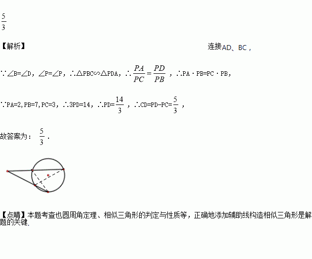 如图,PB、PD分别与圆O相交于A、B、C、D四点,PA=2,PB=7,PC=3则CD=____.