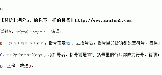 A. x-(y-z)=x-y-z B. -(x-y+z)=-x-y-z