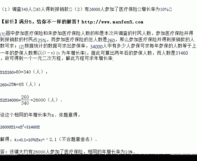 (2)若该镇有34000村民,请估算有多少人参加了医疗保险?要使两年后参加医疗保险的人数增加到业务31460人,假设这两年的年增长率相同,求年增长率?