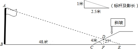 阳光明媚的一天,数学兴趣小组的同学测量学校旗杆AB的高度(如图),发现旗杆AB的影子刚好落在水平面BC和斜坡的CD上,其中BC=48米,CD=4米,斜坡CD的坡角为27°.同一时刻,测得高为1米标杆的影长是2.5米.求出旗杆AB的高度?(结果精确到0.01米)