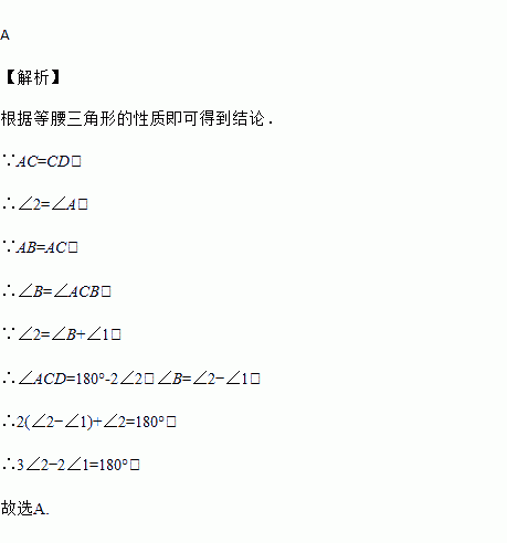 如图,在△ABC中,点D是AB边上一点,且AB=AC=CD,则∠1与∠2之间的关系( )