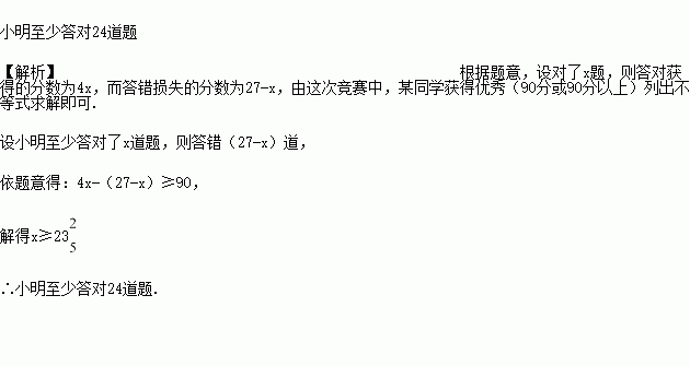我国已于2016年发射天宫二号空间实验室,并发射神舟十一号载人飞船和天舟一号货运飞船,与天宫二号交会对接,为了增强学生的航空航天知识,学校举行航空航天知识竞赛,共30道题,规定答对一道题得4分,答错一道题扣1分,不答得0分。在这次竞赛中,小明有3道题未答,但他仍获得优秀(90分或90分以上),则小明至少答对了几道题?