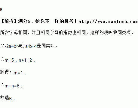 如果-2amb2与a5bn+1的和仍然是单项式,那么m+n的值为( ).