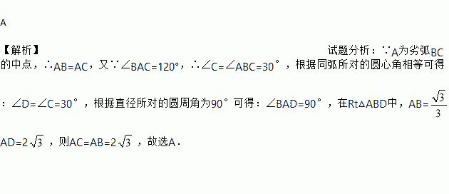 如图,△ABC内接于⊙O,A为劣弧BC的中点,∠BAC=120°,过点B作⊙O的直径BD,连接AD,若AD=6,则AC的长为( )