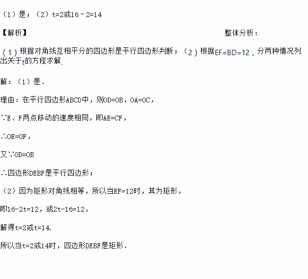 (2)若BD=12cm,AC=16cm,当运动时间t为何值时,四边形DEBF是矩形?