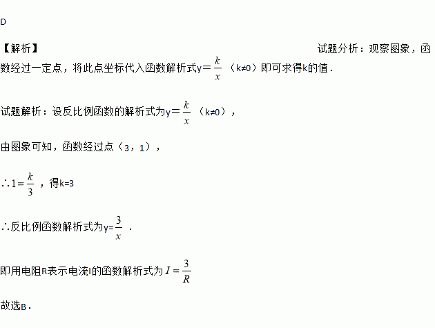 某闭合电路中,电源的电压为定值,电流I(A)与电阻R(Ω)成反比例.如图所示的是该电路中电流I与电阻R之间的函数关系的图象,则用电阻R表示电流I的函数解析式为( )