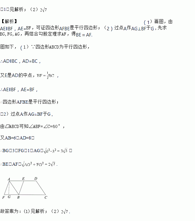 (2)若AB=6,AD=8,∠C=60°,求BE的长.