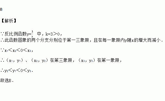 图象上三个点的坐标为(x1,y1)、(x2,y2)、(x3,y3),若x1<x2<0<x3,则y1,y2,y3的大小关系是 ( )