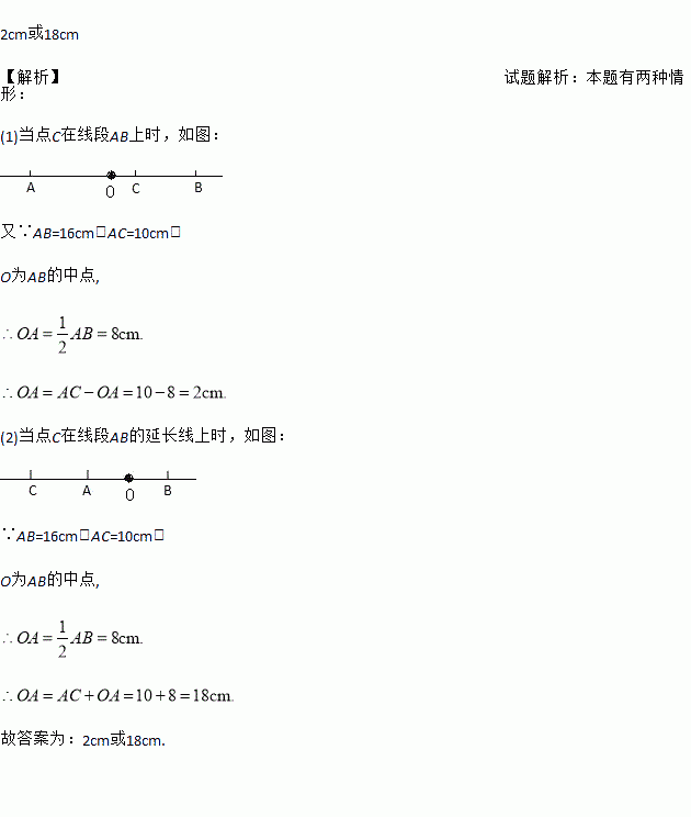 已知线段AB=16cm,点C在直线AB上,且AC=10cm,O为AB的中点,则线段OC的长度是________ .