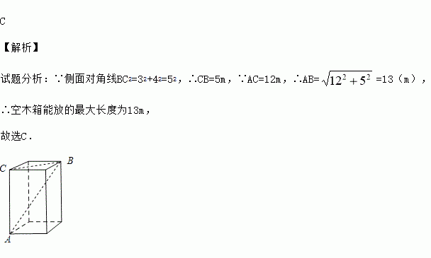 C 【解析】 试题分析:∵侧面对角线BC2=32+42=52,∴CB=5m,∵AC=12m,∴AB==13(m), ∴空木箱能放的最大长度为13m, 故选C.