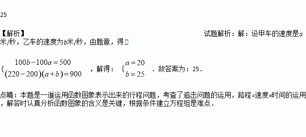 设甲、乙两车在同一直线公路上匀速行驶,开始甲车在乙车的前面,当乙车追上甲车后,两车停下来,把乙车的货物转给甲车,然后甲车继续前行,乙车向原地返回.设x秒后两车间的距离为y米,y关于x的函数关系如图所示,则乙车的速度是_________米/秒.