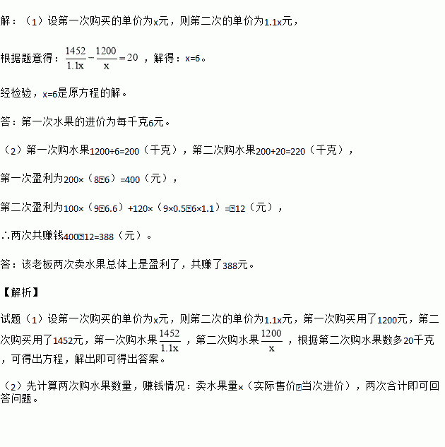 佳佳果品店在批发市场购买某种水果销售,第一次用1200元购进若干千克,并以每千克8元出售,很快售完.由于水果畅销,第二次购买时,每千克的进价比第一次提高了10%,用1452元所购买的数量比第一次多20千克,以每千克9元售出100千克后,因出现高温天气,水果不易保鲜,为减少损失,便降价50%售完剩余的水果.