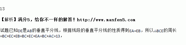 如图,在△ABC中,AC=8,BC=5,AB的垂直平分线DE交AB于点D,交边AC于点E,则△BCE的周长为_______.