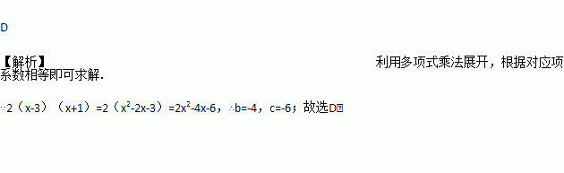 已知多项式2x2+bx+c分解因式为2(x-3)(x+1),则b,c的值为( )
