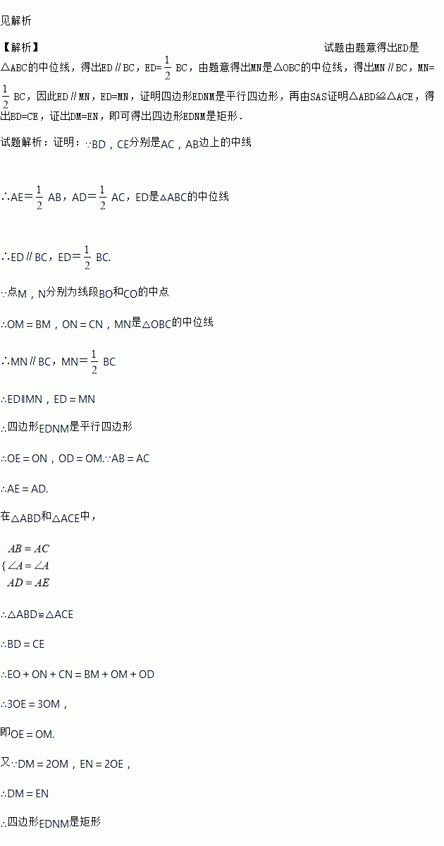 如图,等腰△ABC中,AB=AC,BD,CE分别是边AC,AB上的中线,BD与CE相交于点O,点M,N分别为线段BO和CO的中点.求证:四边形EDNM是矩形.