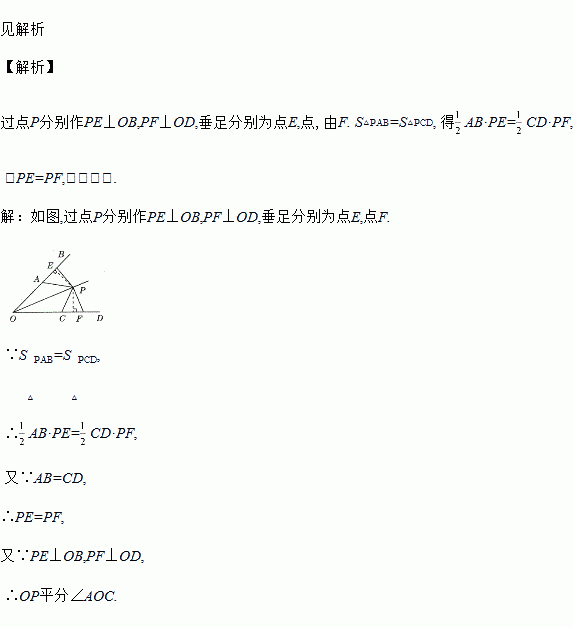 已知,如图,AB=CD,△PAB和△PCD的面积相等,求证:OP平分∠AOC.