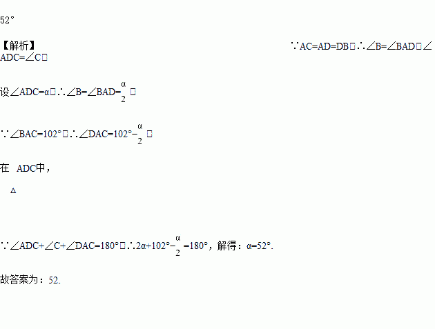如图,在△ABC中,D是BC上一点,AC=AD=DB,∠BAC=102°,则∠ADC=_____.