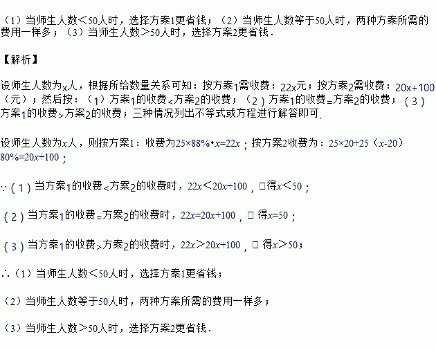 某校组织部分师生到甲地考察,学校到甲地的全程票价为25元,对集体购票,客运公司有两种优惠方案供选择:方案1:所有师生按票价的88%购票;方案2:前20人购全票,从第21人开始,每人按票价的80%购票.你若是组织者,请你根据师生人数讨论选择哪种方案更省钱?