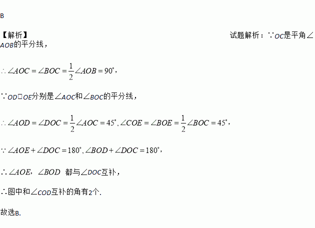 B 【解析】试题解析:∵OC是平角∠AOB的平分线, ∵OD、OE分别是∠AOC和∠BOC的平分线, ∴ 都与∠DOC互补, ∴图中和∠COD互补的角有2个. 故选B.