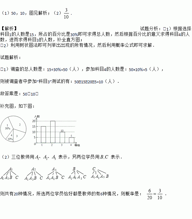 (1)本次被调查的学员共有 人;在被调查者中参加“科目3”测试的有 人;将条形统计图补充完整;