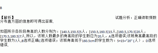 C. 该班身高最高段的学生数为20人 D. 该班身高低于160.5cm的学生数为15人