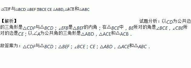 如图,以CD为公共边的三角形是____________;∠EFB是____________的内角;在△BCE中,BE所对的角是____________,∠CBE所对的边是____________;以∠A为公共角的三角形是____________.