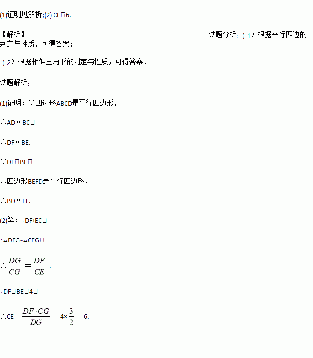 如图,在?ABCD中,点E在边BC上,点F在边AD的延长线上,且DF=BE,EF与CD交于点G.