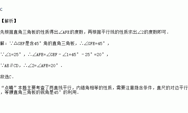 如图,把一块含有 45°角的直角三角板的两个顶点放在直尺的对边上. 如果∠1=15°,那么∠2 的度数是( )