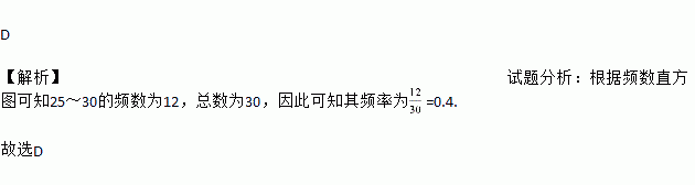 某校为了了解九年级学生的体能情况,随机抽查了其中30名学生,测试了他们做1min仰卧起坐的次数,并制成了如图所示的频数分布直方图,根据图示计算仰卧起坐次数在25~30次的频率是( ).