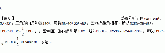 C 【解析】试题分析:由∠ACB=90°,∠A=22°,三角形内角和是180º,可得∠B=90º-22º=68º,因为折叠角相等,所以∠CED=∠B=68º,∠BDC=∠EDC=∠BDE,,因为四边形内角和是360º,所以∠BDE=360º-90º-68º-68º=134º,所以∠BDC=∠BDE=×134º=67º.故选C.