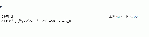 已知直线m∥n , 将一块含30°角的直角三角板ABC按如图方式放置(∠ABC=30°),其中A、B两点分别落在直线m、n上.若∠1=20°,则∠2的度数为 ( )