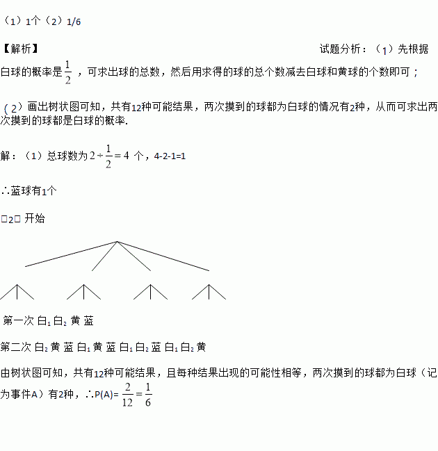(1)1个(2)1/6 【解析】试题分析:(1)先根据白球的概率是,可求出球的总数,然后用求得的球的总个数减去白球和黄球的个数即可; (2)画出树状图可知,共有12种可能结果,两次摸到的球都为白球的情况有2种,从而可求出两次摸到的球都是白球的概率. 【解析】 (1)总球数为个,4-2-1=1 ∴蓝球有1个 (2) 开始 第一次 白1 白2 黄 蓝 第二次...
