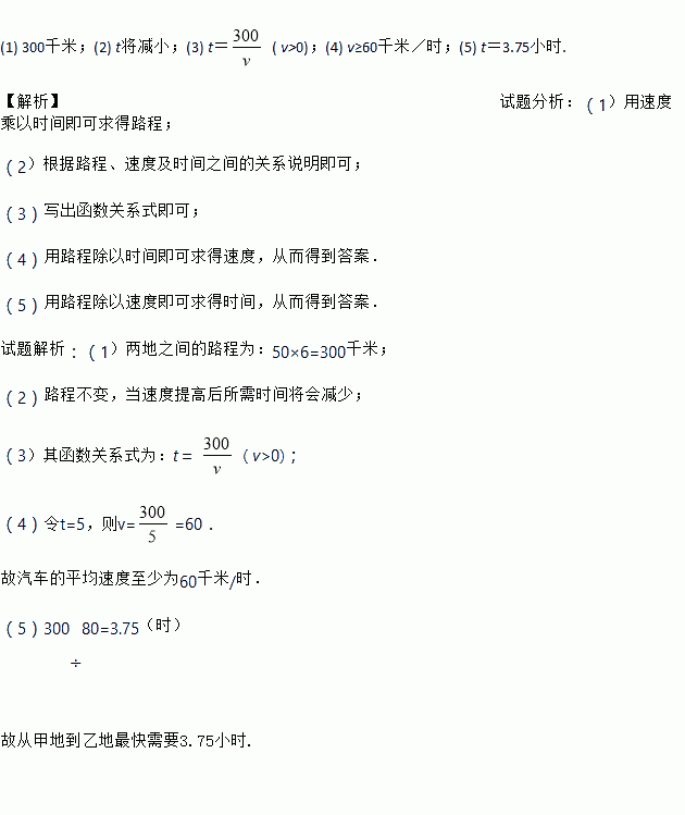 (1) 300千米;(2) t将减小;(3) t= ( v>0);(4) v≥60千米/时;(5) t=3.75小时. 【解析】试题分析:(1)用速度乘以时间即可求得路程; (2)根据路程、速度及时间之间的关系说明即可; (3)写出函数关系式即可; (4)用路程除以时间即可求得速度,从而得到答案. (5)用路程除以速度即可求得时间,从而得到答案. 试题解析:(1...