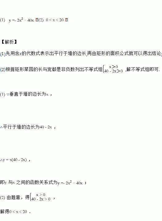 写出这块菜园的面积与垂直于墙的边长之间的函数解析式;