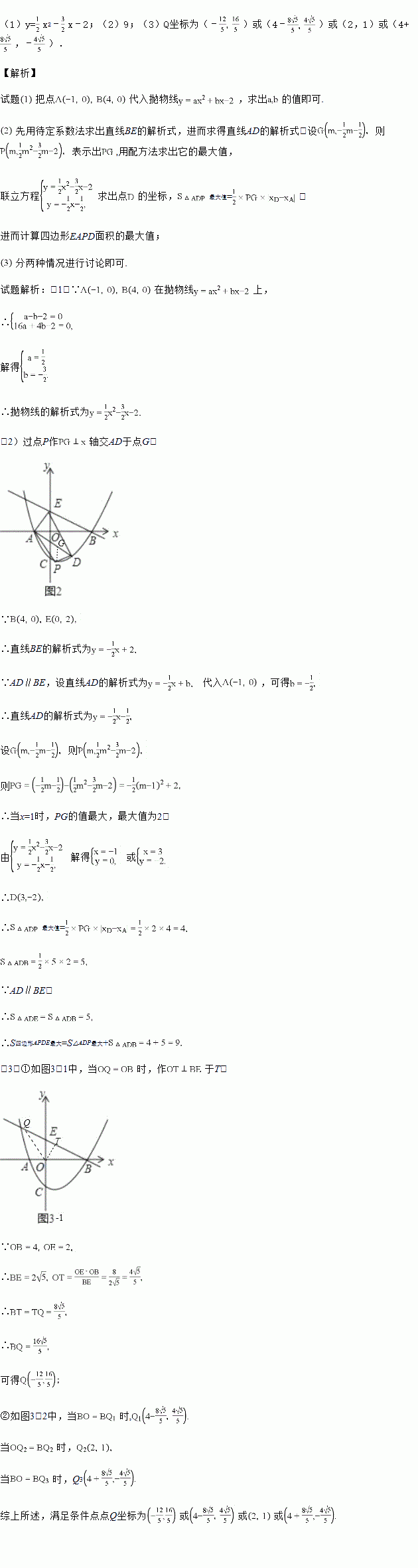 (2)如图2,过点A作BE的平行线交抛物线于另一点D,点P是抛物线上位于线段AD下方的一个动点,连结PA,EA,ED,PD,求四边形EAPD面积的最大值;