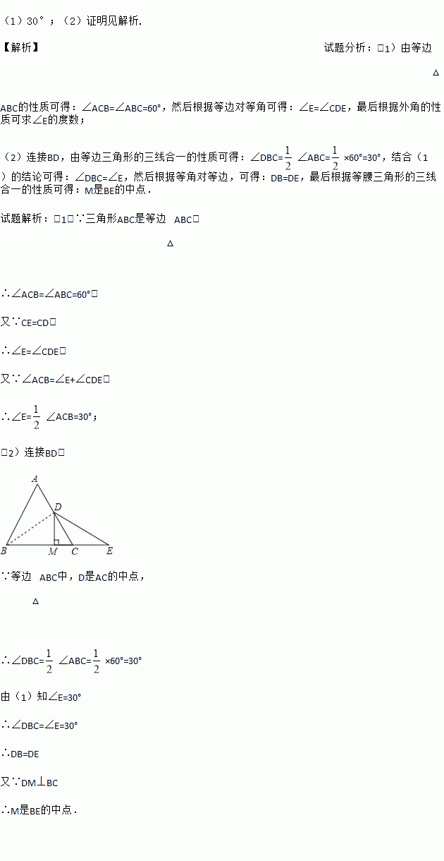 (1)30°;(2)证明见解析. 【解析】试题分析:(1)由等边△ABC的性质可得:∠ACB=∠ABC=60°,然后根据等边对等角可得:∠E=∠CDE,最后根据外角的性质可求∠E的度数; (2)连接BD,由等边三角形的三线合一的性质可得:∠DBC=∠ABC=×60°=30°,结合(1)的结论可得:∠DBC=∠E,然后根据等角对等边,可得:DB=DE,最后根据等腰三角形的三线合一的性质可...