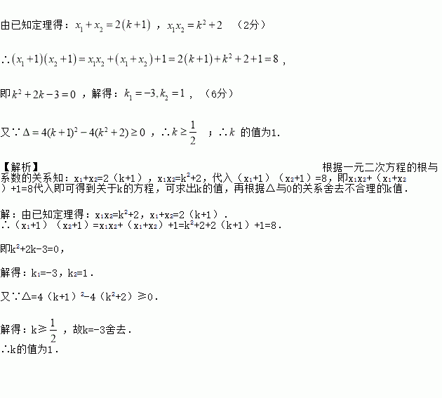 (本题满分9分)定理:若、是关于的一元二次方程的两实根,则有,.请用这一定理解决问题:已知、是关于的一元二次方程的两实根,且,求的值.