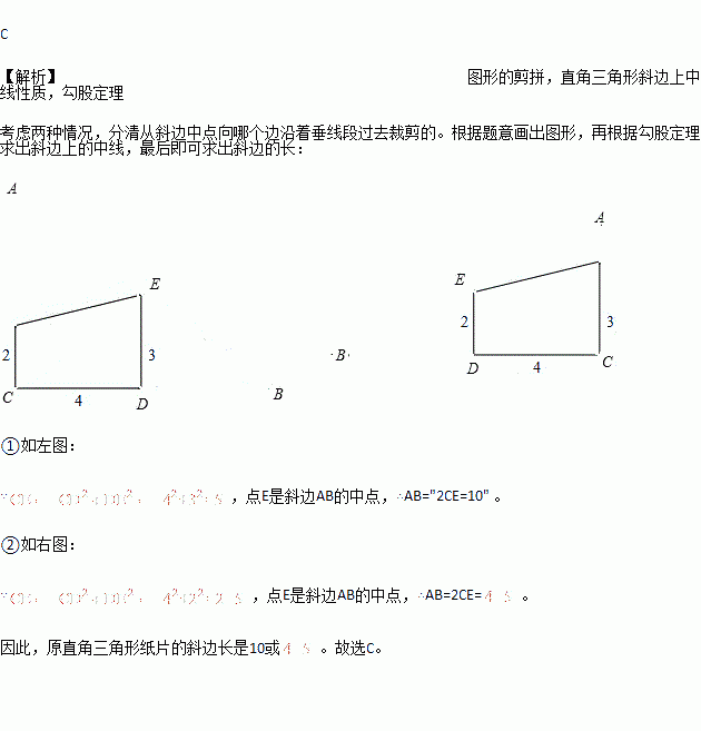 在一张直角三角形纸片的两直角边上各取一点,分别沿斜边中点与这两点的连线剪去两个三角形,剩下的部分是如图所示的直角梯形,其中三边长分别为2、4、3,则原直角三角形纸片的斜边长是( )