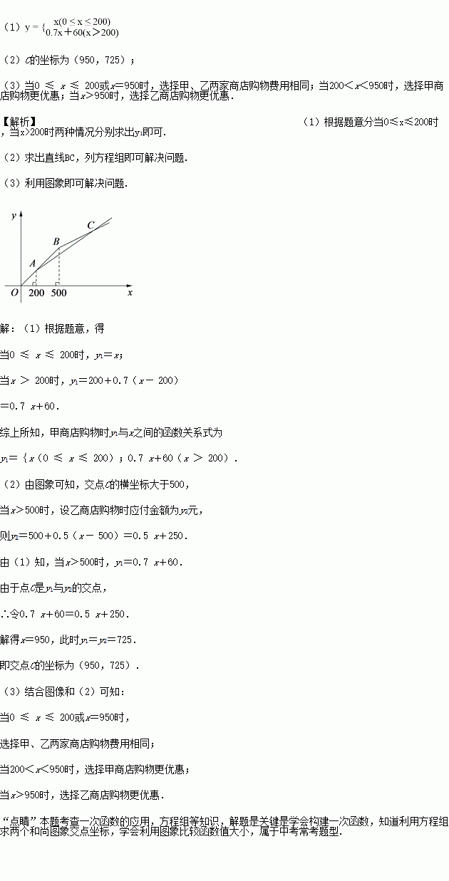 “五一”期间,甲、乙两家商店以同样价格销售相同的商品,它们的优惠方案分别为:甲店,一次性购物中超过200元后的价格部分打七折;乙店,一次性购物中超过500元后的价格部分打五折.设商品原价为x元(x ≥ 0),购物应付金额为y元.