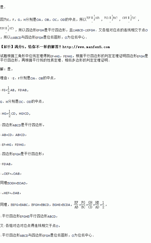 如图所示,□ABCD的对角线AC,BD相交于点O,E、F、G、H分别是OA、OB、OC、OD的中点,那么□ABCD与四边形EFGH是否是位似图形?为什么?