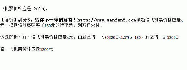 有一位旅客携带了30kg重的行李从上海乘飞机去北京,按民航总局规定:旅客最多可免费携带20kg重的行李,超重部分每千克按飞机票价格1.5%购买行李票,现该旅客购买了180元的行李票,则飞机票价格应是多少元?