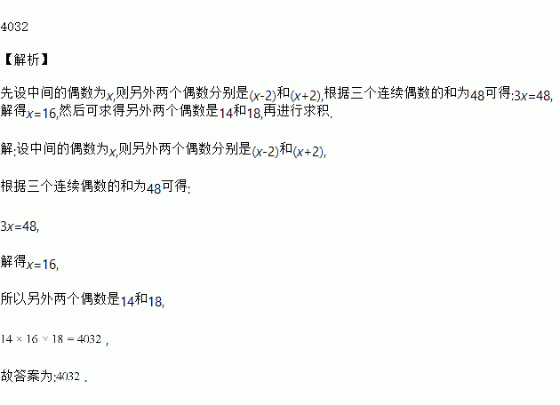 三个连续偶数的和为48,则这三个偶数的积为__________.