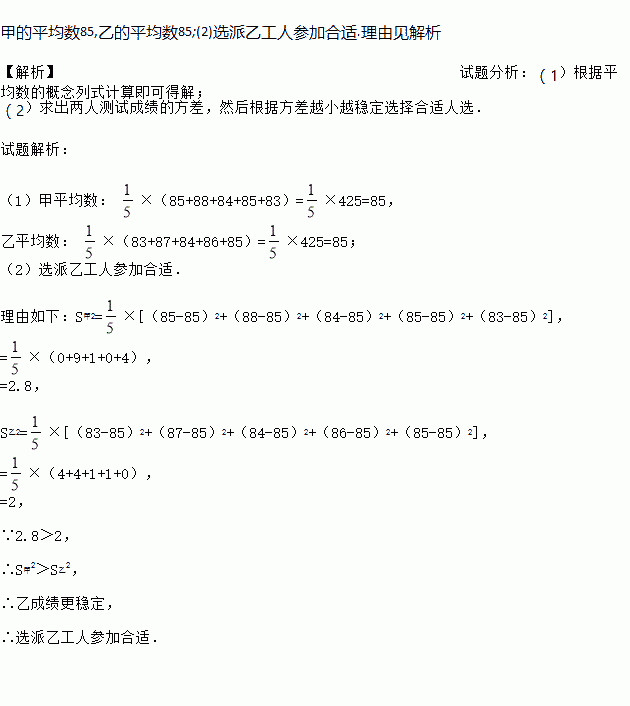 某工厂甲、乙两名工人参加操作技能培训,现分别从他们在培训期间参加的若干次测试成绩中随机抽取5次,记录如下: