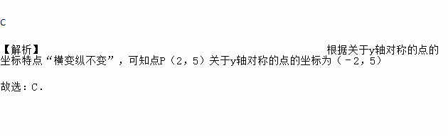 C 【解析】根据关于y轴对称的点的坐标特点“横变纵不变”,可知点P(2,5)关于y轴对称的点的坐标为(﹣2,5) 故选:C.