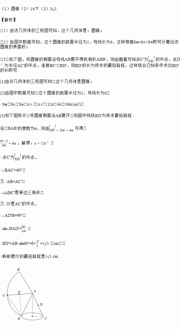 (3)如果一只蚂蚁要从这个几何体上的点B出发,沿表面爬到AC的中点D,请你求出这条路线的最短路程.